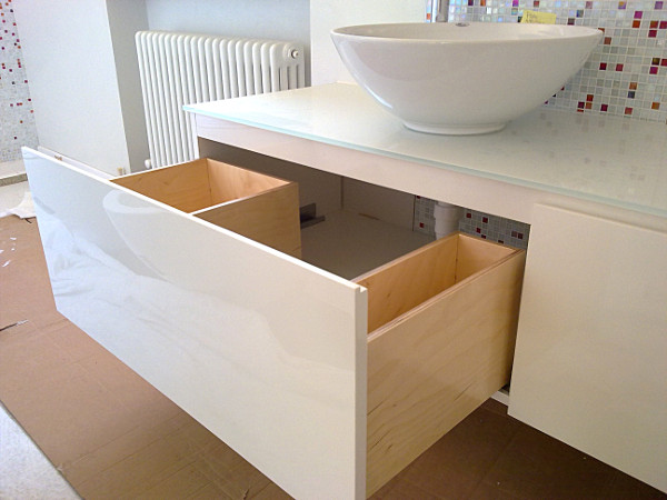 Bagno in multistrato fenolico e ante laccate bianco lucido.
