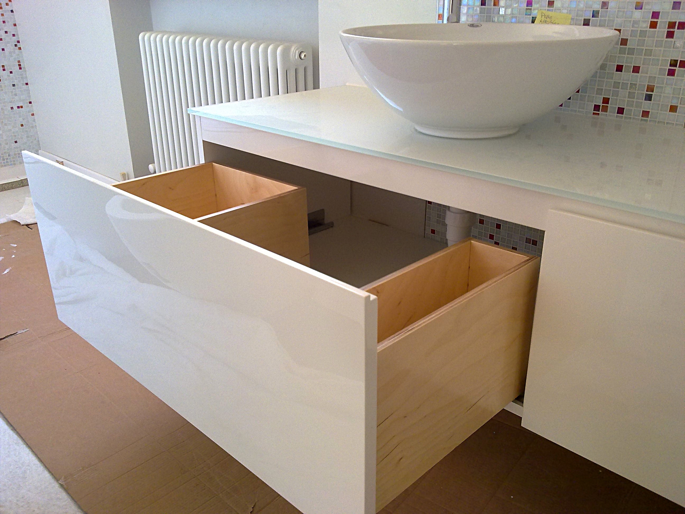 Realizzato in multistrato fenolico (legno marino), con finitura laccata lucida e piano in cristallo extrachiaro retro laccato