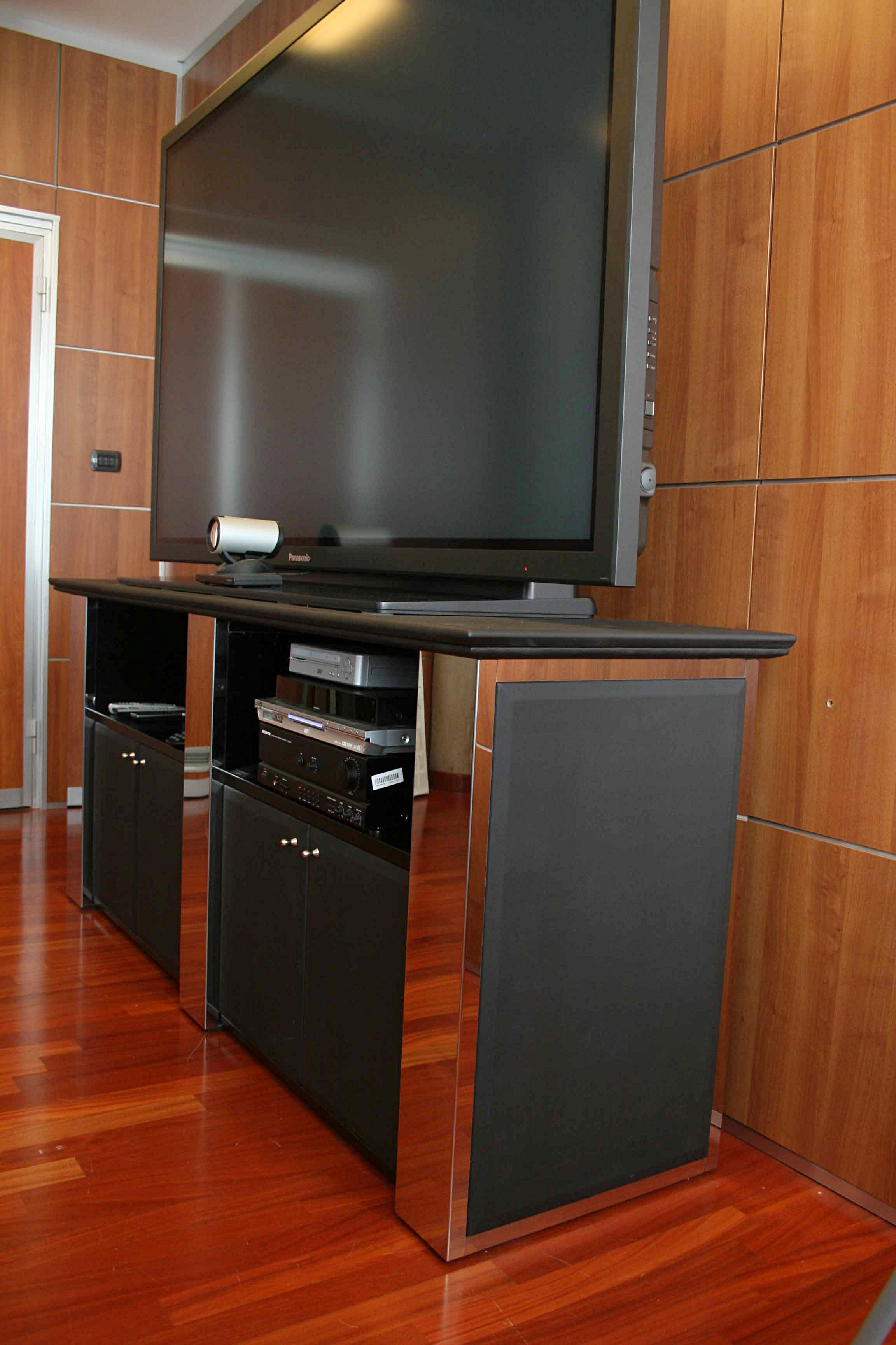 Mobile porta tv in accaio lucido e pannelli bisellati rivestiti in pelle nera.
